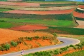 是在不同的角度看大片起伏有致的山坡。不同季节山坡上不同的地块有不同的色彩,勤劳的农民在其中耕作或收获。丽日蓝天,白云红土,赤橙红绿青蓝紫构成的美景。
